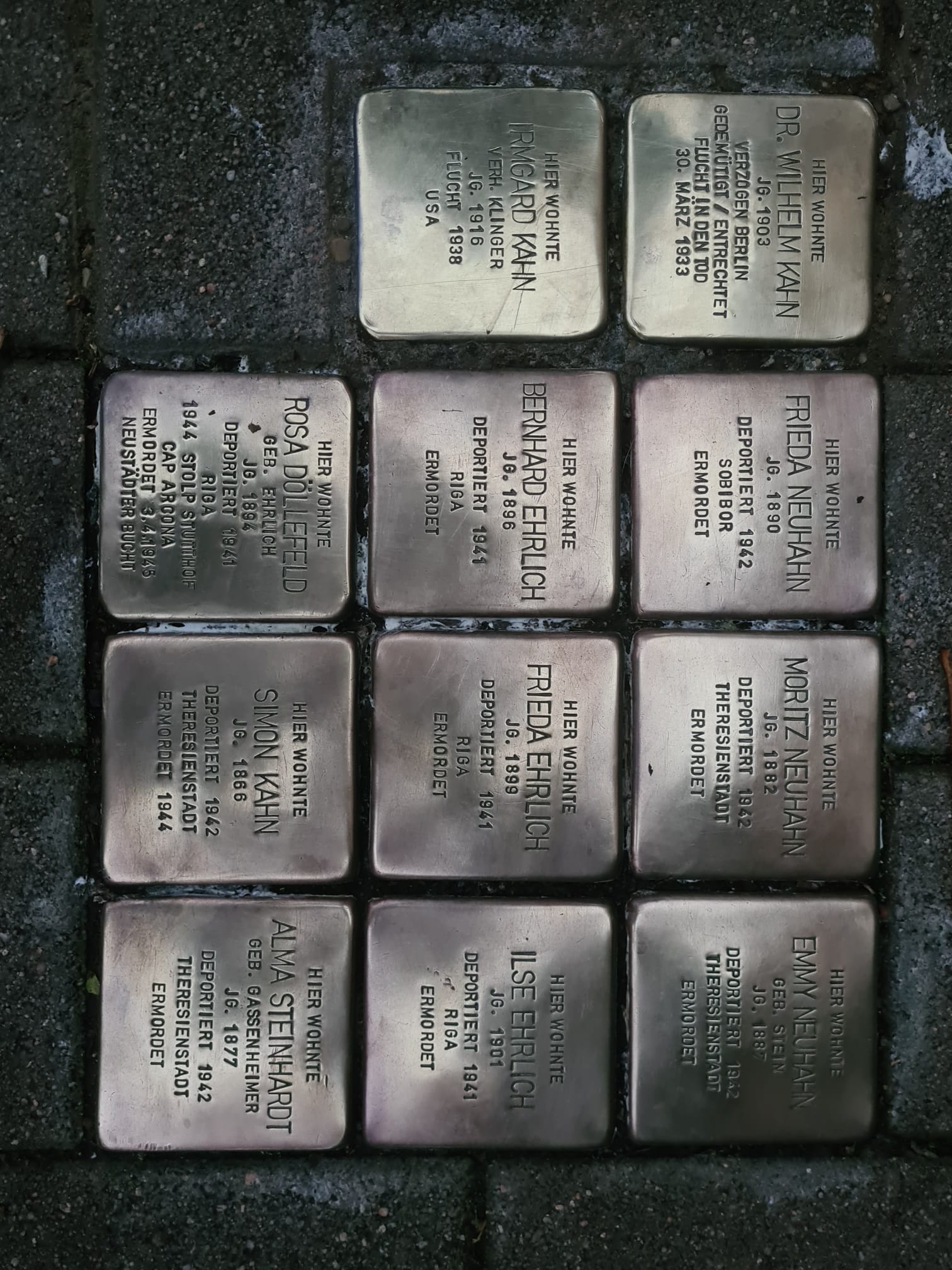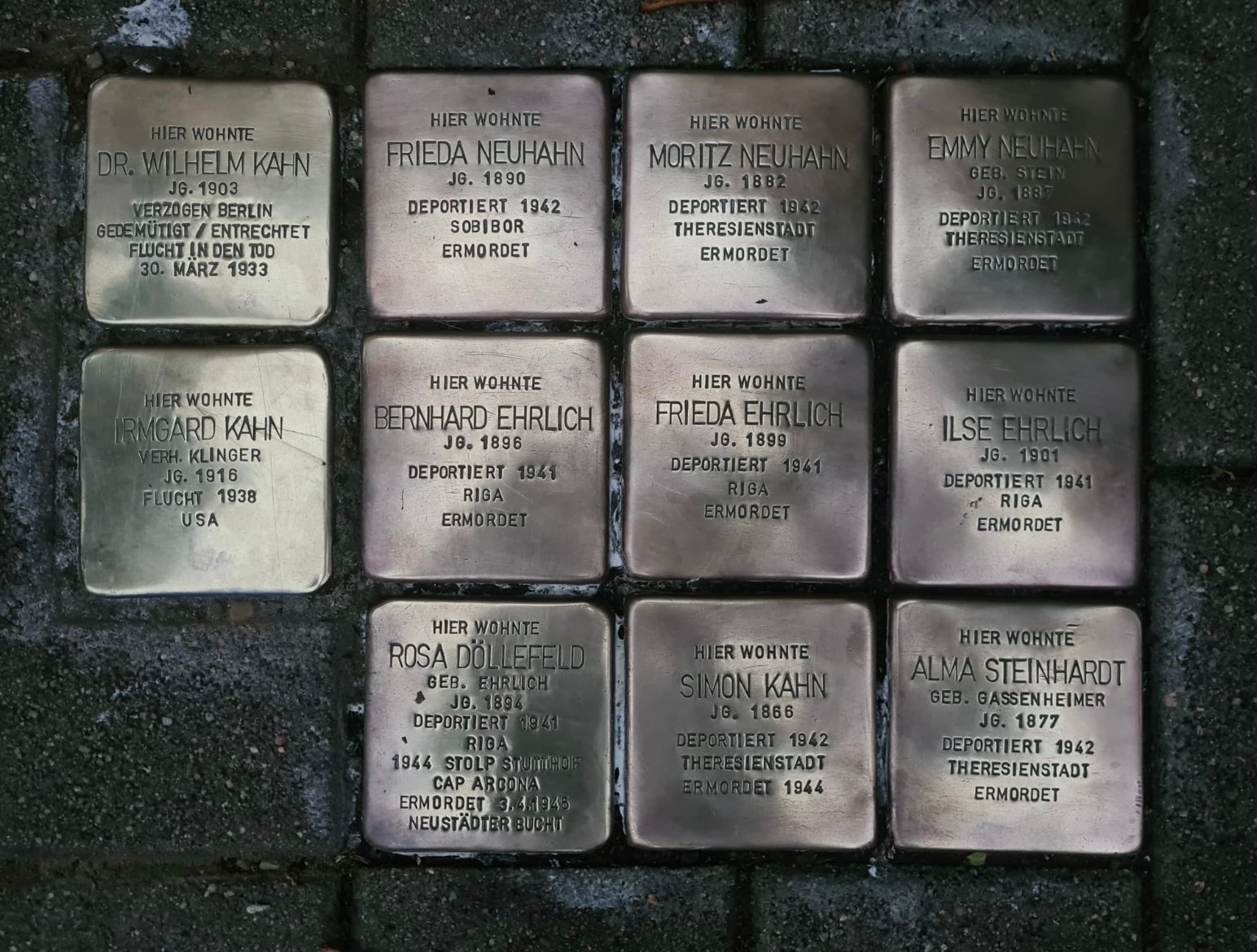 Dr. Wilhelm Kahn, Irmgard Kahn, Simon Kahn, Frieda Neuhahn, Moritz Neuhahn, Emmy Neuhahn(geborene Stein), Bernhard Ehrlich, Frieda Ehrlich, Ilse Ehrlich, Rosa Döllefeld (geborene Ehrlich), Alma Steinhardt (geborene Gassenheimer),