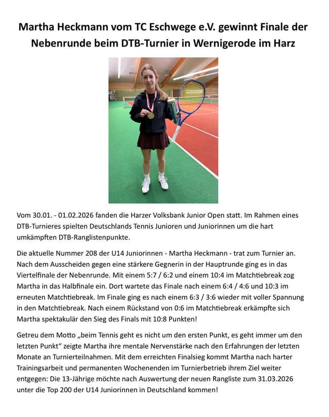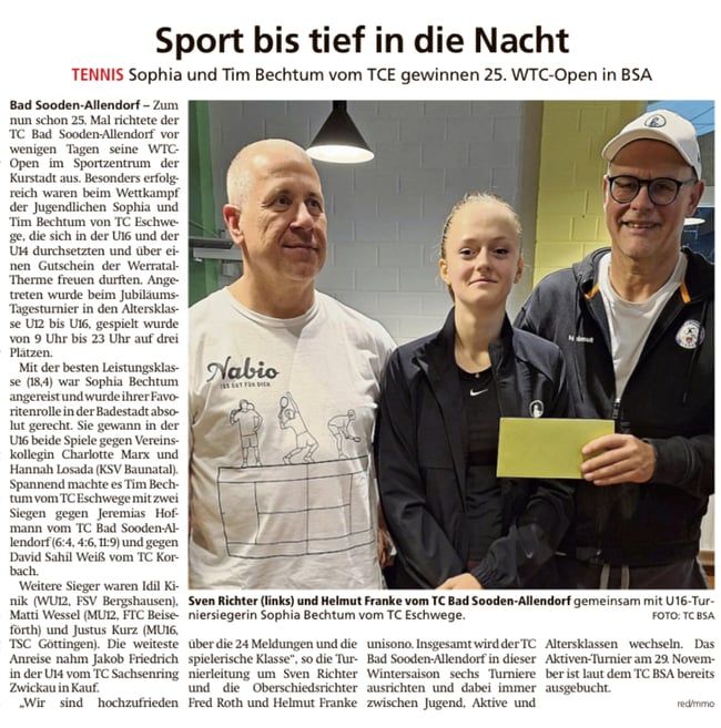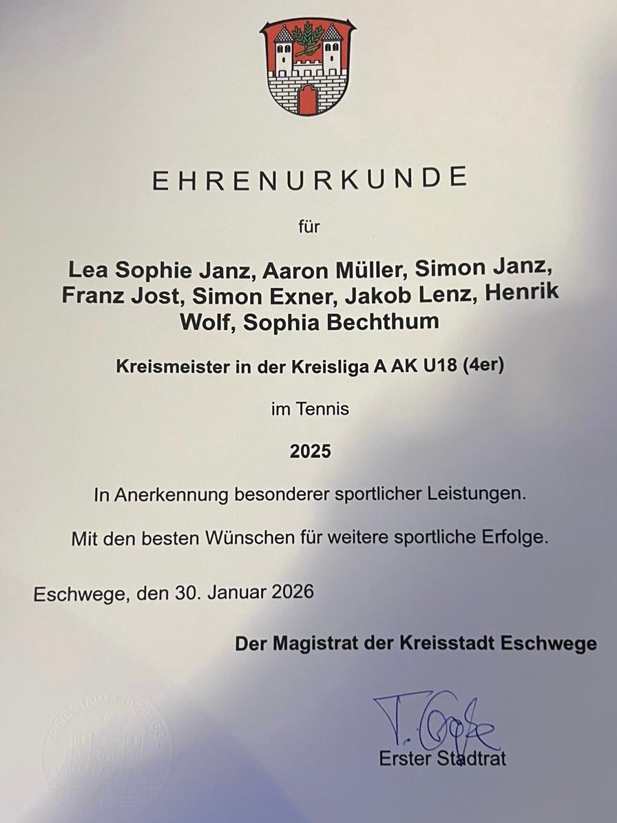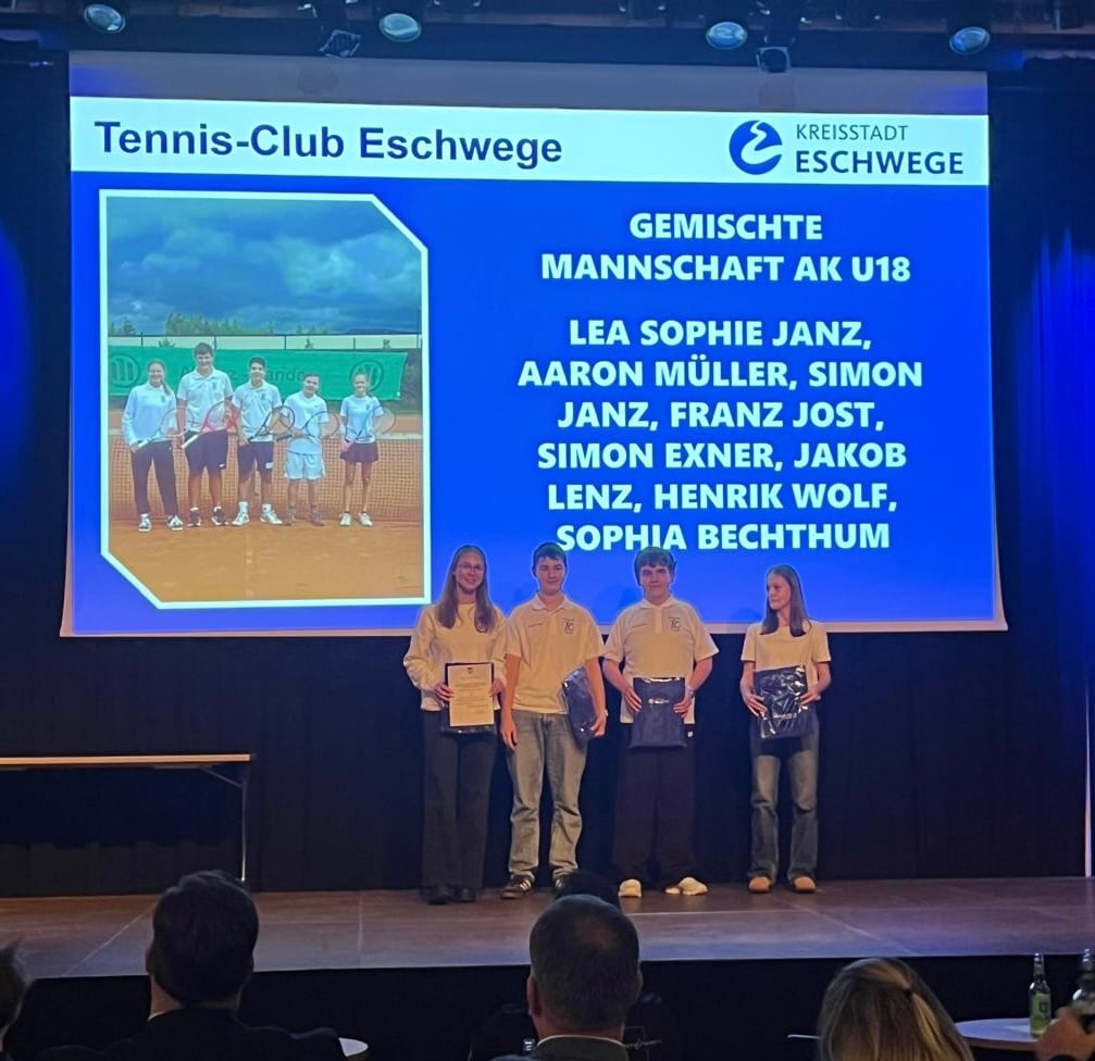 Hervorgehoben wurde zudem die U18-Mannschaft des Tennisclub Eschwege, die in der Kreisliga A antrat. Für ihren besonderen Einsatz und Teamgeist erhielten die Spielerinnen und Spieler eine zusätzliche Ehrenurkunde. Diese ging an Lea Janz, Aaron Müller, Simon Janz, Franz Jost, Simon Exner, Jakob Lenz, Henrik Wolf und Sofia Bechthum.