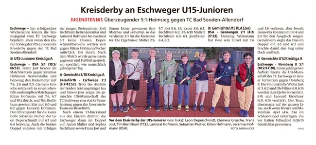 Unsere U15 I gewann in ihrem letzten Medenspiel am 6. September mit 5:1 gegen BW Bad Hersfeld, und sichert sich damit nach 6 Begegnungen den 1. Rang ihrer Gruppe! Das habt ihr wirklich spitze gemacht! Eine sehr starke Leistung! Wir sind sehr stolz und gratulieren!!!