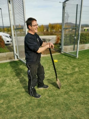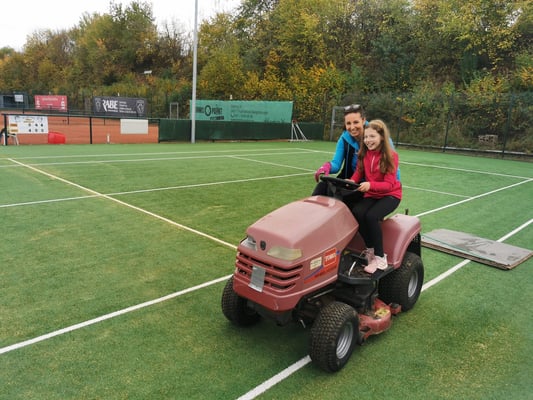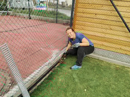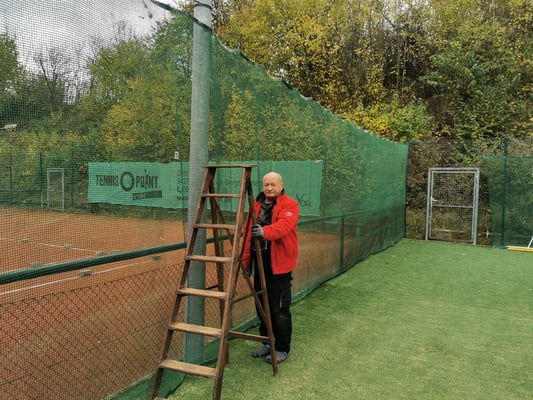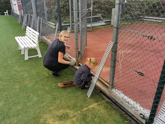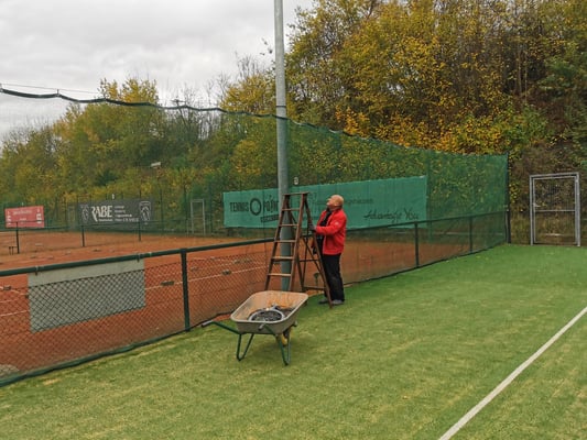 Als besondere Aufgabe gab es in diesem Jahr nun auch, neben Unkraut entfernen, Netzte und Sichtschutz abhängen, Linien befestigen, Büsche schneiden und den letzten Rasenschnitt, die Säuberung und Bearbeitung unseres neuen Allwetterplatzes.